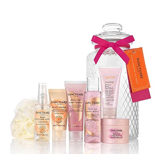 Sanctuary Good Enough To Treat. Delve into the ultimate collection of Sanctuary goodies. This gift contains: 75ml White Lily & Damask Rose Body Wash 50ml WLDR Body Butter 50ml White Lily & Damask Rose Body Scrub 50ml Moisture Spray 30ml Hand Cream 30ml Moisture Burst Facial Wash Body Puff