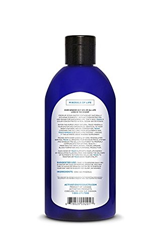 Trace - Pure Ocean Minerals by Activation Products, Makers of Magnesium Ease and Oceans Alive. Contains essential trace minerals found in our nutrient rich Oceans. These trace minerals are necessary for every function in the human body to maintain balance and health. Left in their most bio-available form, All-Natural liquid trace minerals balance the body's pH level while supplying essential minerals. Packed with over 2,000 mg of ionic minerals per serving, Trace Pure Ocean Minerals illuminates your bio-electrical system and enables the cells to communicate in the way they were designed to. RESTORE: Supply your body with the Bio-Available Minerals CELL MAINTENANCE: Every organ and cell requires maintaining a supply of Trace minerals for a healthy life FULL SPECTRUM: Trace Pure Ocean Minerals contains the Full Spectrum of Elements and Trace Minerals of our Living Oceans. SUPERIOR QUALITY & PURITY: Our Trace Pure Ocean Minerals is one of the purest natural Trace Liquid Mineral Supplements available 100% Pure & Tested. No Chemicals, No Fillers, No Animal Testing.